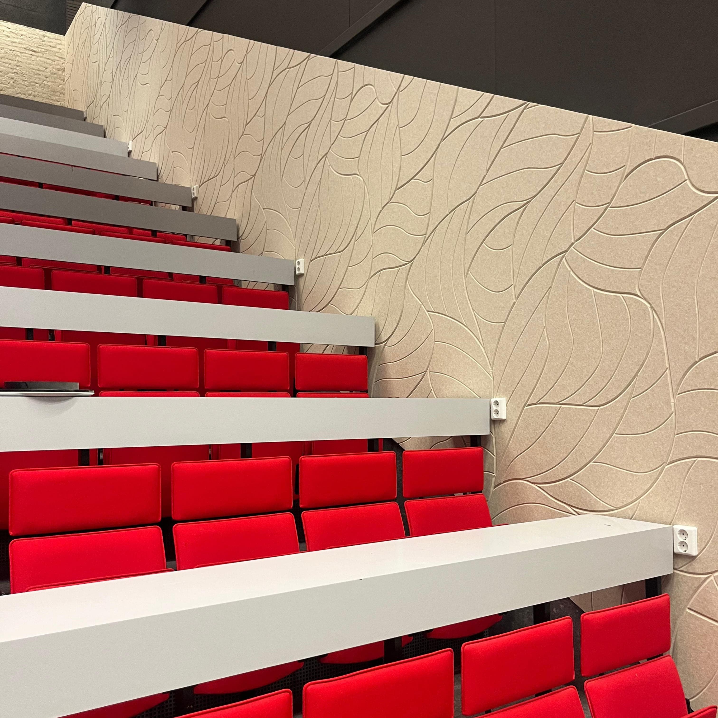 The placement of the Lamella Wall is surprising. The PET felt panels are not mounted on the wall but on a cabinet. This creates an elegant separation that fits perfectly into the open space of the university. Functional and visually appealing.